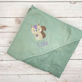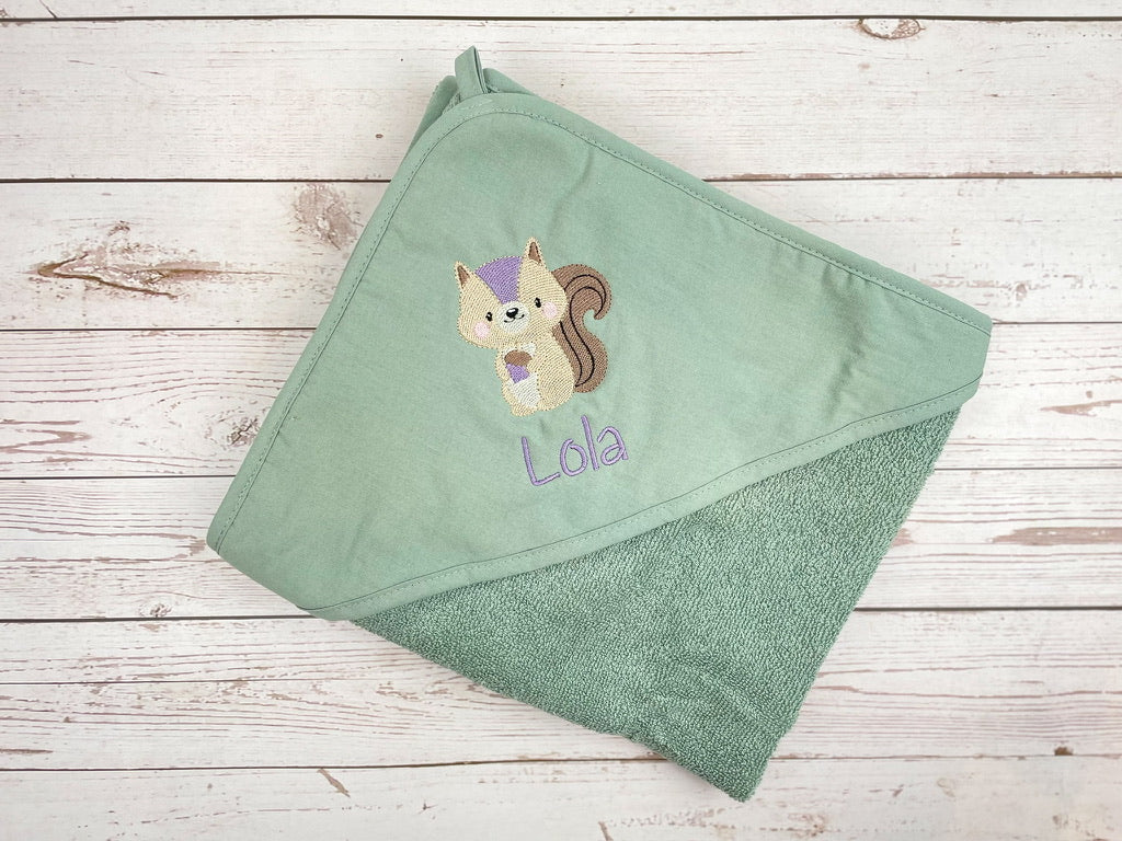Personalisiertes Kapuzenhandtuch bestickt mit Eichhörnchen und Name.